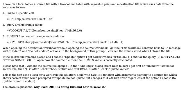 #value error when updating SUMIFS formulas with range from another workbook in Excel 2013 Helpful? Please support me on Patreon: https://www.patreon.com/roelvandepaar With thanks & praise to God, and with thanks to the many people who have made this project possible! | Content (except music & images) licensed under CC BY-SA https://meta.stackexchange.com/help/licensing | Music: https://www.bensound.com/licensing | Images: https://stocksnap.io/license & others | With thanks to user Sebastian Deac (superuser.com/users/364871), user CharlieRB (superuser.com/users/97028), and the Stack Exchange Network (superuser.com/questions/807150). Trademarks are property of their respective owners. Disclaimer: All information is provided "AS IS" without warranty of any kind. You are responsible for your own actions. Please contact me if anything is amiss at Roel D.OT VandePaar A.T gmail.com