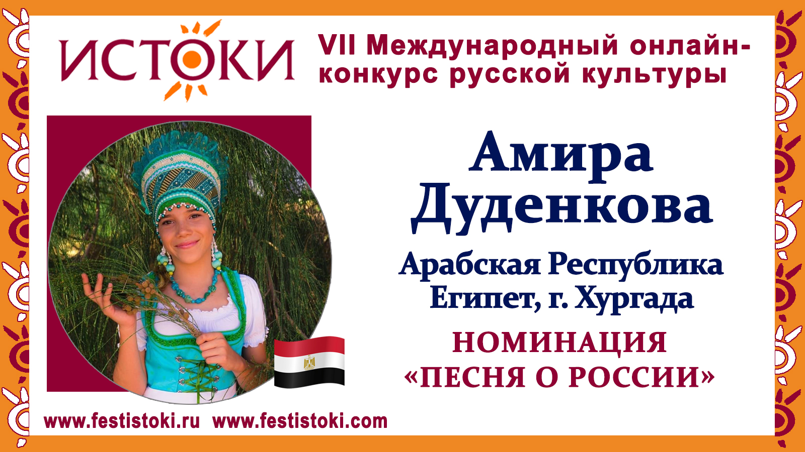 Участник VII Международного онлайн-конкурса русской культуры "Истоки". Номинация "Песня о России". Песня "Катюша". Композитор Матвей Блантер, автор слов Михаил Исаковский. Сайт: www.festistoki.ru / www.festistoki.com E-mail: festistoki@mail.ru
