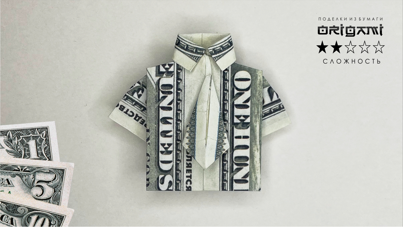 Как сложить рубашку из купюры. Подробный видео урок Манигами. Эта инструкция покажет вам, как сделать симпатичное оригами в виде рубашки и галстука из долларовой купюры •Наверное, каждый из нас хранит в кошельке счастливую купюру, и чтобы она просто так ровненькой там не лежала, можно из неё сделать интересную вещь, такую как – рубашку с галстуком, да и просто, чтобы показать друзьям. Для это вам понадобится купюра любого достоинства, как российского, так и иностранного. ● Уровень сложности: ★★★☆☆ ● Для поделки Вам понадобится: - 1 ДЕНЕЖНАЯ КУПЮРА ● В ЭТОМ ВИДЕО: #оригамиизденег #манигами #оригамиизкупюры #каксделать #поделкиизденег #moneygami #изденег #видео #изкупюры #пошагово #своимируками #манигамисхемы #оригами #diy #изденежнойкупюры ● В видео используются трек - We Are Happy, Tenderness (00:01), Автор трека - FSM Team, музыка взята с сайта https://www.free-stock-music.com, тип лицензии — Creative Commons / Attribution 3.0 Unported License (CC BY 3.0). (https://creativecommons.org/licenses/by/3.0/