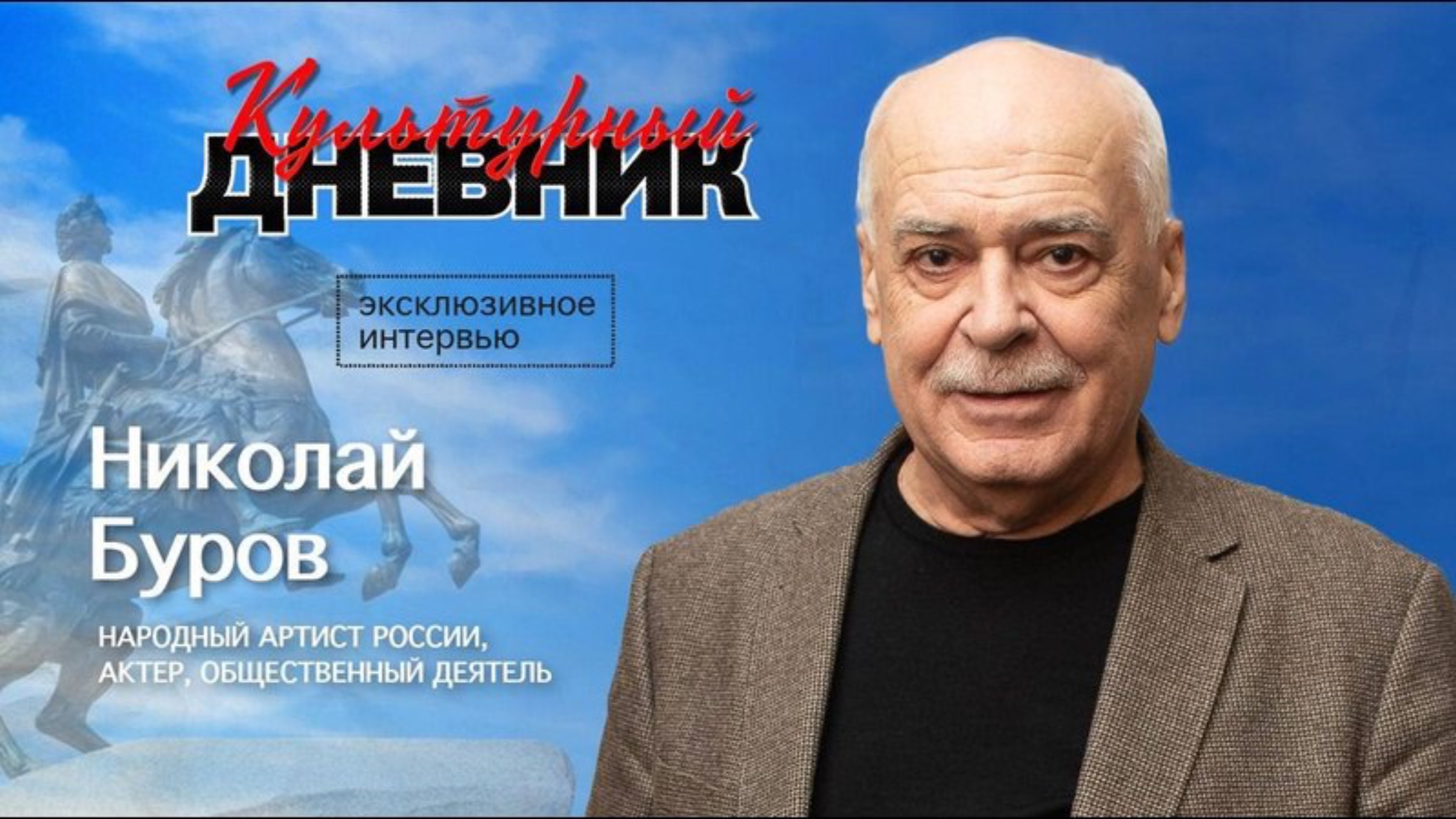 Смотрите эксклюзивное интервью с Народным артистом России, актером театра и кино Николаем Буровым. 00:00 — Николай Буров: новый гость "Культурного дневника"; 01:08 — Какую роль Союз театральных деятелей играет в культурной жизни нашего города?; 02:34 — Про концертный зал Союза театральных деятелей; 03:56 — Зачем актерам нужны премии и награды?; 04:53 — Про медаль Жукова; 05:23 — Про фильм «Блокадная кровь»; 08:04 — Про родителей; 11:18 — Театр юношеского творчества повлиял на выбор профессии?; 11:57 — Про поступление в театральный; 13:18 — Про сыгранные роли в театре Юного зрителя; 16:38 — Вы себя ощущаете больше актером театр или кино?; 17:56 — Про дубляж; 19:17 — Что важно в работе музейного сотрудника?; 22:12 — Какой Ваш Петербург?; 22:26 — Что для Вас семья?; 24:30 — Что для Вас счастье?; 24:59 — В чем секрет успеха?;