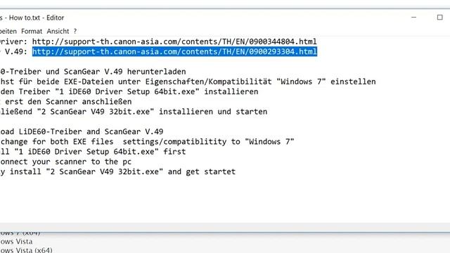 LiDE60-Driver: http://support-th.canon-asia.com/contents/TH/EN/0900344804.html ScanGear V.49: http://support-th.canon-asia.com/contents/TH/EN/0900293304.html 1. LiDE60-Treiber und ScanGear V.49 herunterladen 2. Zunächst für beide EXE-Dateien unter Eigenschaften/Kompatibilität "Windows 7" einstellen 3. Dann den Treiber "1 iDE60 Driver Setup 64bit.exe" installieren 4. Jetzt erst den Scanner anschließen 5. Abschließend "2 ScanGear V49 32bit.exe" installieren und starten