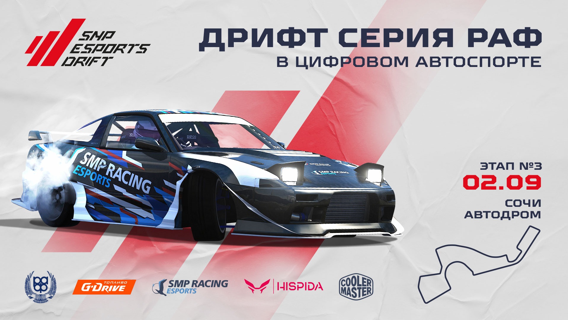 Первые в России масштабные соревнования по виртуальному дрифту проходят в три этапа на цифровых копиях российских гоночных трасс. Подробная информация о серии - по ссылке https://smpesports.ru/ru/championship/37 Генеральный партнер соревнований – высокотехнологичное топливо G-Drive cети АЗС «Газпромнефть» (http://gpnbonus.ru). G-Drive многократно испытано в топовых автоспортивных соревнованиях, а в своих заездах его тестируют чемпионы престижных российских и международных гонок – команда G-Drive Racing. Заправляйтесь высокотехнологичным топливом регулярно, чтобы обеспечить двигателю своего автомобиля профессиональную защиту и полностью раскрыть его потенциал. Партнер чемпионата - Cooler Master (https://vk.com/officialgroup_cm), легендарный бренд в мире высокотехнологичных компьютерных компонентов, аксессуаров и игровой периферии. Технический партнер чемпионата - игровые компьютеры HISPIDA (http://www.hispida.ru/), которые помогут выйти на новый уровень. #SMPRacing #SMPRacingEsports #VirtualDrift