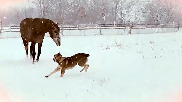 Сегодня была метель, выпал большой снег, которого все мы ждали целых 2 года... Лошадь вышла из укрытия попастись, но мы с собакой ей не дали покоя, заставили играть и резвиться) #лошади#снег#собака