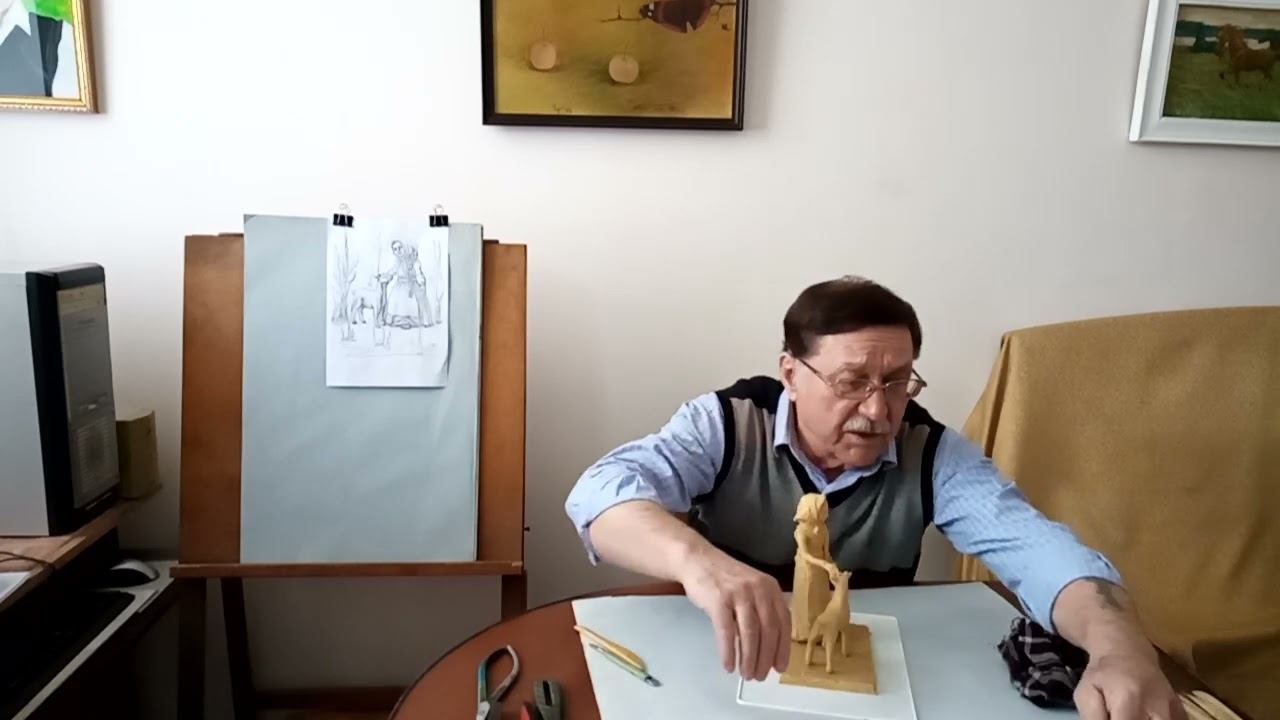 В этом уроке по лепке круглой скульптуры «Алёнушка и братец Иванушка» для первого класса учитель переходит к финальной детализации и установке фигур на плинт после набора общей массы. Педагог заранее подготовил полуготовые фигурки девочки и козлёнка‑Иванушки, чтобы показать установку: Алёнушку ставят первой из‑за устойчивого основания, Иванушку размещают ближе, протягивают её руку так, чтобы она гладила его рожки, создавая нежный момент общения между сестрой и превращённым братом. Затем идёт проработка деталей: стеком заделывают шероховатости, уточняют копытца козлёнка (сзади и спереди), ножку девочки из‑под платьица, передничек, открывают глазки обеим фигурам. Для полноты композиции добавляется окружающая среда леса: высохшее деревце, камешек с травой, кустики сзади, что указывает на заболоченное место, где Алёнушка нашла брата. Учитель корректирует наклон головы девочки, чтобы усилить диалог между персонажами, подчёркивая важность динамики движения и взаимодействия в двухфигурной композиции с живыми существами. В финале демонстрируется готовая работа, где глазки открыты, позы выразительны, а Иванушка словно просит прощения у сестрёнки. Педагог завершает урок пожеланиями успехов и ждёт аналогичные завершённые композиции от учеников. Автор - художник Гончаров Николай Васильевич (1944-2025)