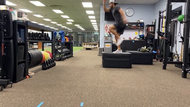Band resisted step-up with knee drive