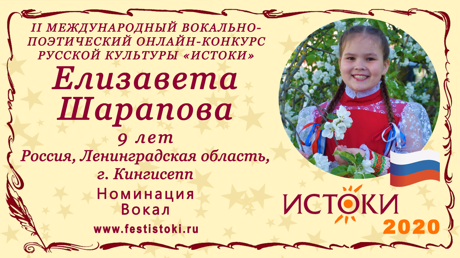 Лауреат III степени II Международного вокально-поэтического онлайн-конкурса русской культуры «Истоки». Номинация - Вокал. Русская народная песня "Я молодешенька". Сайт: www.festistoki.ru / www.festistoki.com E-mail: festistoki@mail.ru