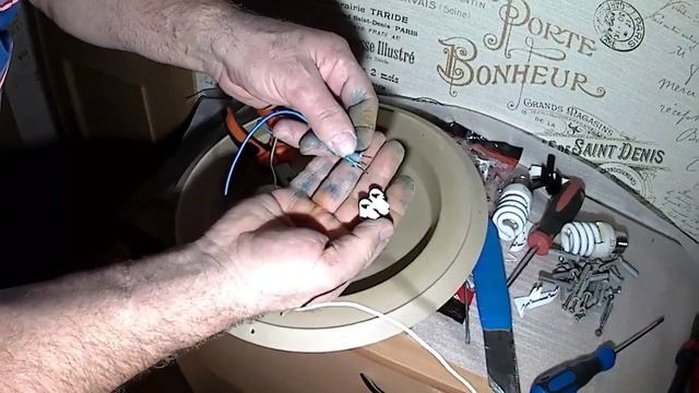 Провода светильника- тарелка от использования более мощных ламп накаливания, чем рекомендованные (перегрев) и длительной работы, практически оголились. Если не отремонтировать светильник, возможно или короткое, или возгорание. Порядок и принцип ремонта - на видео.