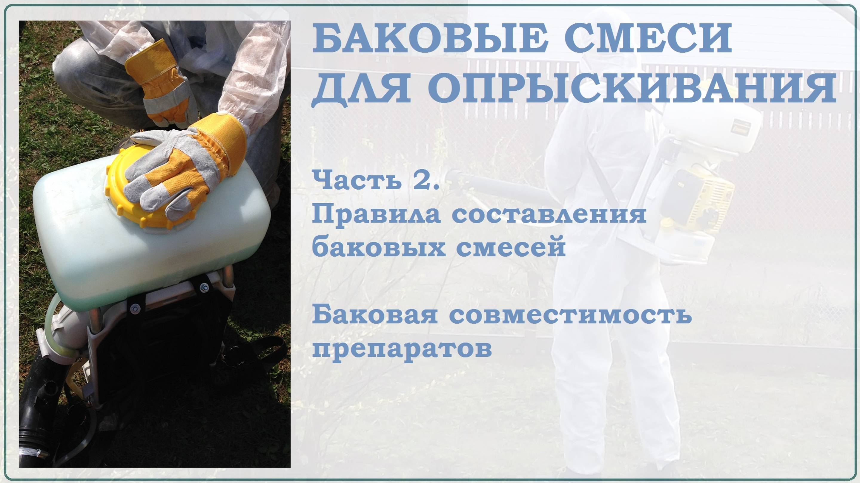 Правила составления баковых смесей для опрыскивания: 1. Несовместимые комбинации препаратов. 2. Где найти информацию о совместимости средств защиты растений? 3. Тест на баковую совместимость. 4. Подбор компонентов для баковой смеси. 5. Сколько компонентов должно быть в баковой смеси? 6. Смешивать нужно маточные растворы препаратов. 7. Порядок добавления компонентов в баковую смесь. 8. Сроки хранения готовых баковых смесей. 9. Ограничения в применении баковых смесей.
