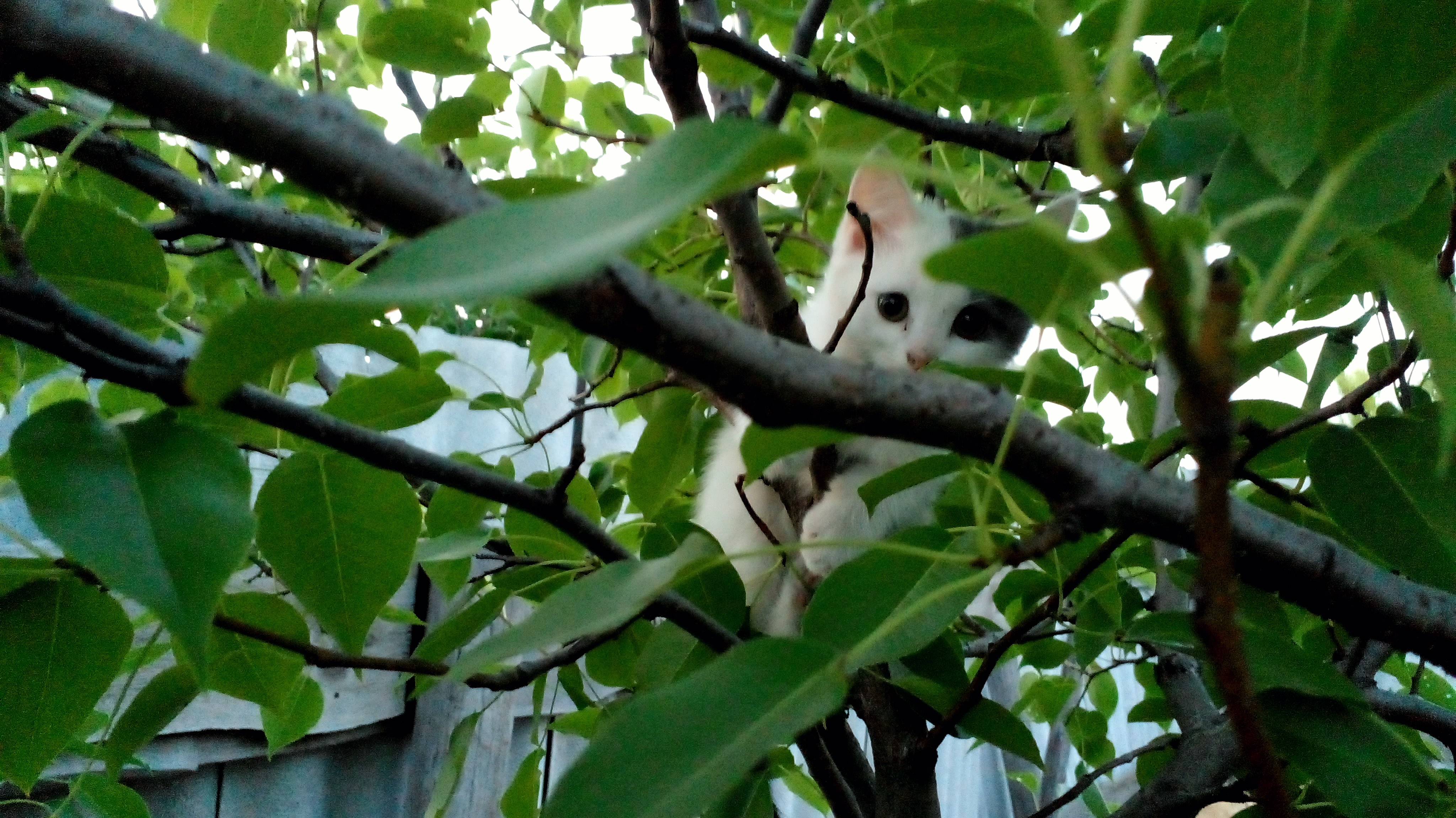 Котёнок Буся залез на грушу. Нашёл место для игр!