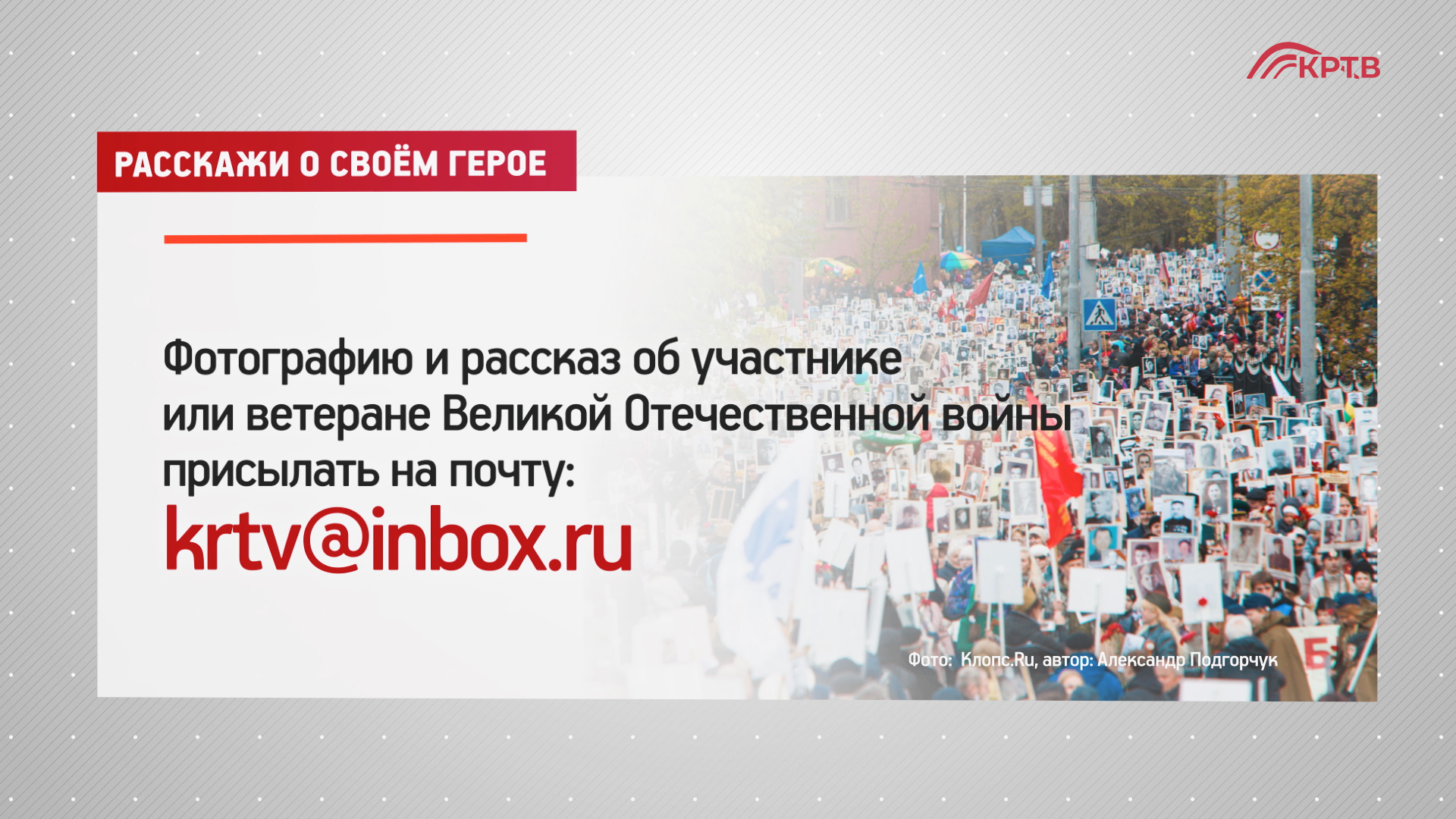 Мы сохраняем память об участниках Великой Отечественной войны, расскажи и ты о своём герое! КРТВ объявляет телешествие «Бессмертного полка Красногорска». Присылайте фотографии и короткий рассказ о своих участниках войны на почту krtv@inbox.ru. Округ должен знать истории победителей.