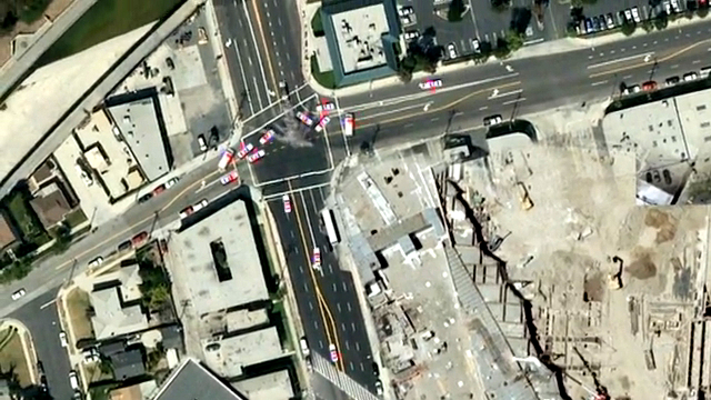 Преступник пытается скрыться, за его автомобилем следует группа служителей закона на полицейских автомобилях. Видео был создано с использованием Google Maps.