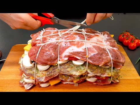 Рецепт вкусного и сочного мяса. Этот рецепт будут просить все! Привет всем на моем канале!? Отличный рецепт свиной шеи на праздники или на каждый день. Мясо получается очень сочным и вкусным. Секрет вкусного мяса – сочетание хорошего маринада и идеальной начинки. Вы можете приготовить мясное блюдо по моему рецепту дома и удивить своих гостей. ************************* Ингредиенты: 1,5 кг (3,3 фунта) свиной шеи. Разрежьте на 4 части, как показано на рисунке. Накройте фольгой. Отбить свинину. Соль и перец. Повторите с другой стороны. Оставьте мясо мариноваться на 30 минут. 2 луковицы. Соль и перец. Укроп. Раздавить лук, чтобы пустить сок. 1 столовая ложка горчицы. 1 столовая ложка дижонской горчицы. 3 зубчика чеснока. 200 г (0,4 фунта) грибов. 2 помидора. Горчица. Лук. Потом грибы. Томатный слой. 100 г сыра. Повторите слои 2 раза. Завяжите мясо, как показано на видео. Выложите мясо на пергаментную бумагу. 3 картофелины. Грибы. Соль и перец. Сухой укроп. Выпекать при температуре 180°C/356°F 70–90 минут. Наслаждайтесь!? Попробуйте мои рецепты и вы останетесь довольны! ?? Напишите свое мнение о рецепте в комментариях, будет интересно узнать ваше мнение ? ?Дорогие подписчики, оставляйте комментарии, делитесь моим видео со своими друзьями и близкими (просто нажмите кнопку «Поделиться»). ? Подписывайтесь на канал, там много других интересных рецептов!