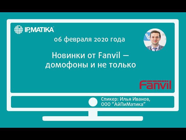 06 февраля 2020 года с 12:00 до 13:00 (МСК) продакт-менеджер компании АйПиМатика Илья Иванов провел вебинар "Новинки от Fanvil — домофоны и не только", в ходе которого были рассмотрены следующие темы: - общие сведения и преимущества оборудования Fanvil; - модели 2018 года, доступные на складе в настоящее время — Fanvil i12-02 и Fanvili18S; - новинки Fanvil — i16, i32, i33, i10(V): сферы применения, кейсы, преимущества; - Fanvil Х210i — интеграция новинки с системами безопасности; - Fanvil iW30 — интеграция с системами безопасности.