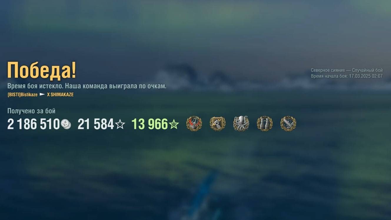 Эсминец Shimakaze. Игрок: Bistikaze (EU). Карта: Северное сияние - Случайный бой. Урон: 224к. Shimakaze - Эсминец Японии 10 уровня.