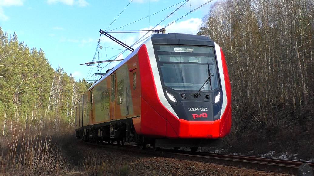 Электропоезд ЭС104-003 "Финист" сообщением №7085 Каменск-Уральский — Екатеринбург следует по перегону Лечебный - Путевка. Свердловская ЖД. Свердловская область, Россия. Приписка: ТЧПРИГ-21 Свердловск. 05.04.2024