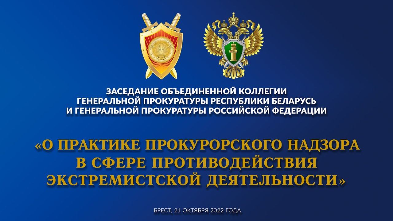 В Бресте под председательством генеральных прокуроров Беларуси и России Андрея Шведа и Игоря Краснова состоялось заседание Объединенной коллегии Генеральной прокуратуры Республики Беларусь и Генеральной прокуратуры Российской Федерации, на которой рассмотрен вопрос о практике прокурорского надзора в сфере противодействия экстремистской деятельности. Участники заседания обсудили результаты работы по стабилизации общественно-политической обстановки и координации деятельности правоохранительных блоков, вопросы сотрудничества генеральных прокуратур по противодействию экстремизму, терроризму и недопущению реабилитации нацизма. По итогам заседания Объединенной коллегии принят за основу проект решения, направленный на дальнейшее укрепление и совершенствование взаимодействия по противодействию экстремизму, подписан План совместных мероприятий Генеральной прокуратуры Республики Беларусь и Генеральной прокуратуры Российской Федерации на 2023 год. В рамках визита Генеральный прокурор Республики Беларусь Андрей Швед и Генеральный прокурор Российской Федерации Игорь Краснов возложили венки к Вечному огню в мемориальном комплексе «Брестская крепость-герой» и почтили память погибших за Родину минутой молчания, посетили музейную экспозицию. Сюжет телеканала «Беларусь 4».
