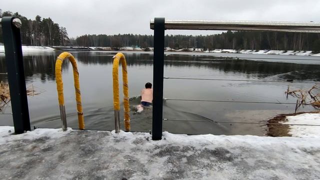 Закаливание, моржевание на Южном озере в Черноголовке. Температура воздуха +1 градус. Температура воды +4 градуса