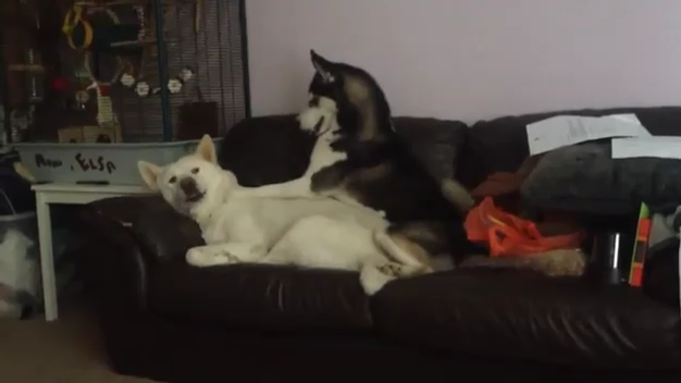 Хаски пытается поднять своего друга с дивана. #смешно #хаски #собаки #милота