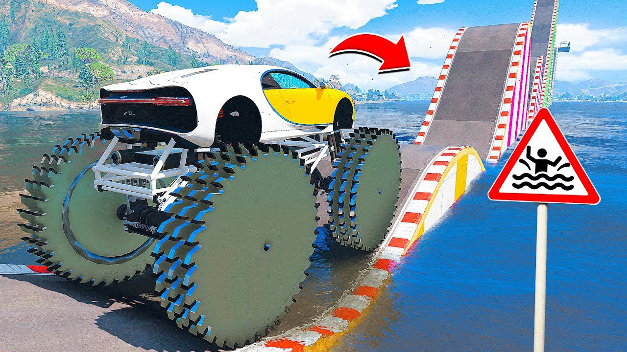 СМОЖЕТ ЛИ ГИГАНТСКАЯ БУГАТТИ С ПИЛАМИ ПРОЕХАТЬ ВОДНЫЕ ТРАМПЛИНЫ в ГТА 5 МОДЫ - ЭКСПЕРИМЕНТЫ в GTA 5