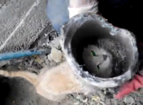 Кошка залезла в ливневую трубу, пришлось брать отбойник и вызволять ее. Видео снято в Ставрополье.