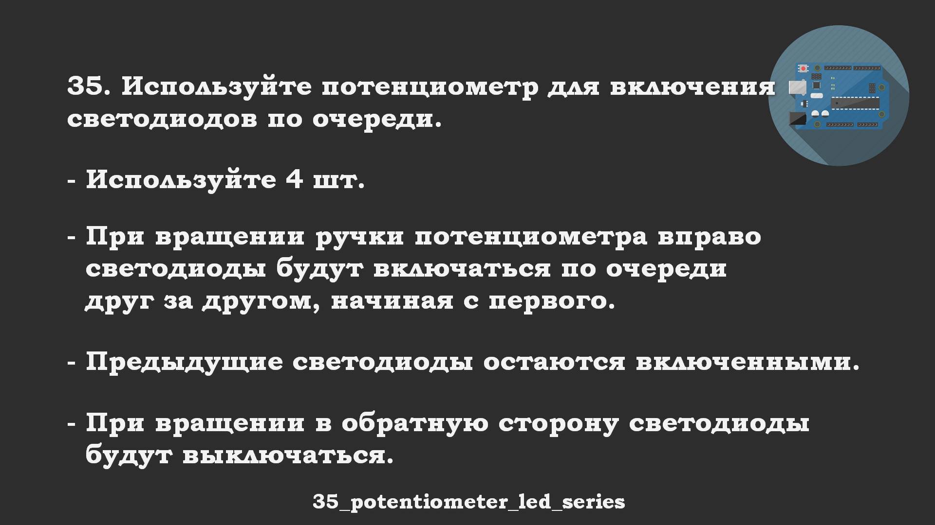 Rutube ответ: https://rutube.ru/video/8bebdb8678e89597633b5f975452c0c2/ 35. Используйте потенциометр для включения светодиодов по очереди. Используйте 4 шт. При вращении ручки потенциометра вправо светодиоды будут включаться по очереди друг за другом, начиная с первого. Предыдущие светодиоды остаются включенными. При вращении в обратную сторону светодиоды будут выключаться. 35_potentiometer_led_series Весь код "Arduino Starter Kit задачи для начинающих (Набор Ардуино)" с задачами и ответами: https://gitflic.ru/project/lashko_ag/arduino-starter-kit-zadachi-dlya-nachinaushchih-nabor-arduino Telegram-канал Arduino робототехника: https://t.me/arduino_robotics_channel Rutube плейлист Arduino Starter Kit: задачи для начинающих (Набор Ардуино): https://rutube.ru/plst/1196693/ Rutube плейлист: ответы на задачи: https://rutube.ru/plst/1196692/ #Arduino #StarterKit #НаборАрдуино #ОбучениеArduino #Программирование #ОбучениеПрограммированию #КурсыArduino #ПрограммированиеДляНачинающих #lashko #АлексейЛашко