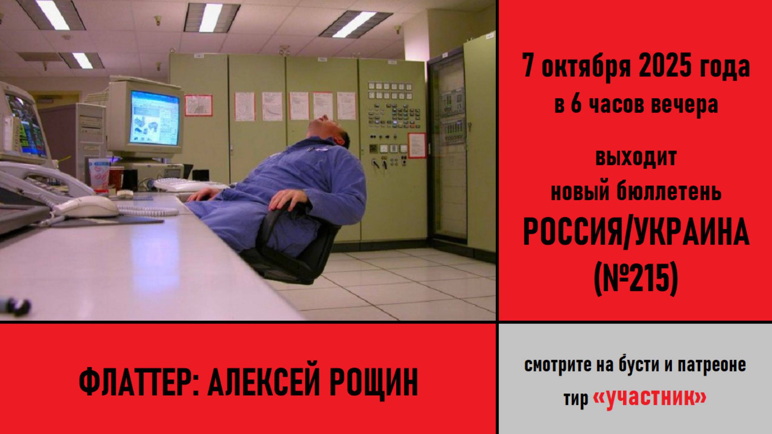 Анонс российско-украинского бюллетеня №215. 7 октября 2025 года в 6 часов вечера выходит новый бюллетень РОССИЯ/УКРАИНА №215 «Флаттер: Алексей Рощин» Смотрите полную версию на бусти и патреоне на тире «Участник»: https://boosty.to/galkovsky/posts/e50c2c36-d90a-4879-8f8d-b1f8c1c88d3f https://www.patreon.com/posts/140665635 Ждём вас!