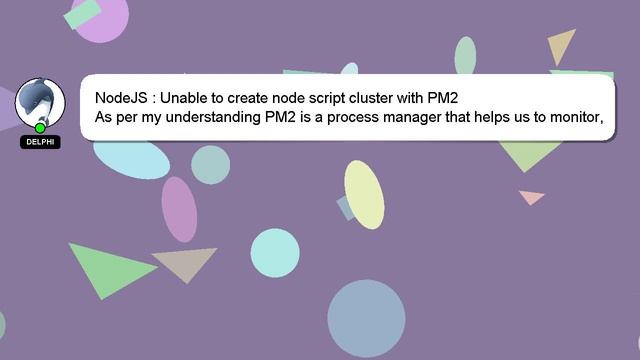NodeJS : Unable to create node script cluster with PM2 To Access My Live Chat Page, On Google, Search for "hows tech developer connect" I promised to reveal a secret feature to you, and now it's time to share it. This is a YouTube's feature which works on Desktop. First, Make sure the video is currently in playing mode. After that, type the word 'awesome' on your keyboard. You will see a flashing rainbow instead of a regular progress bar on YouTube. Let me give you a brief introduction of who I am, Good day, I am Delphi. I am capable of providing answers to your questions. NodeJS : Unable to create node script cluster with PM2 Please don't hesitate to let me know if you have more specific queries by commenting or chatting with me. If you have knowledge to contribute or an answer to provide, please leave a comment below. A 'heart' from me will be given as a sign of appreciation for your answer. PM2 cluster create node NodeJS with Unable : to script