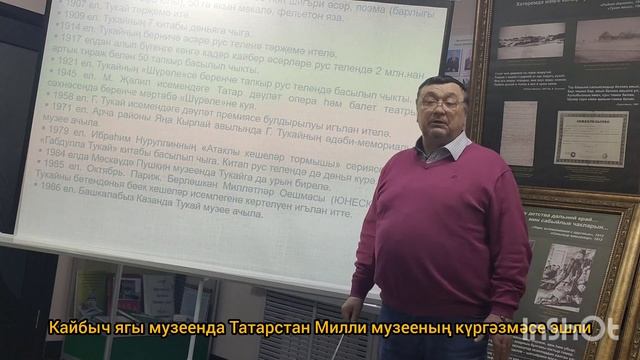 Кайбыч ягы музеенда Татарстан Милли музееның күргәзмәсе эшли Кайбыч ягы музеенда Татарстан Милли музееның Габдулла Тукайның тормыш юлын чагылдырган күчмә күргәзмә эшли башлады.Күргәзмә бөек шагыйрьнең 140 еллыгы уңаеннан оештырылган. Музей директоры Илдар Шакиров Олы Кайбыч урта мәктәбе укучылары белән берлектә музей дәресе үткәрде. Әлеге дәрестә Җаек шәһәренә барып, Габдулла Тукайның андагы тормышы белән танышып кайткан Галия Кайбицкая музее директоры Чулпан Камалиева, район башлыгының элеккеге урынбасары Рәмис Хәялиев, “Кайбыч таңнары” газетасының бүлек редакторы Мингазиз Сөнгатуллин да чакырылган иде. Илдар Шакиров укучыларга Габдулла Тукайның Җаек шәһәренә күчеп киткәнчегә кадәрге тормыш юлы белән таныштырды. Рәмис Хәялиев бөек шагыйрьнең Җаек шәһәрендәге тормышы, аның якташыбыз Мотыйгулла хәзрәт Төхватуллин ярдәме белән шагыйрь булып формалашуы турында сөйләде. Соңыннан Илдар Шакиров укучыларны Татарстан Милли музееның Габдулла Тукайның тормышына багышланган күчмә күргәзмәсе белән таныштырды.