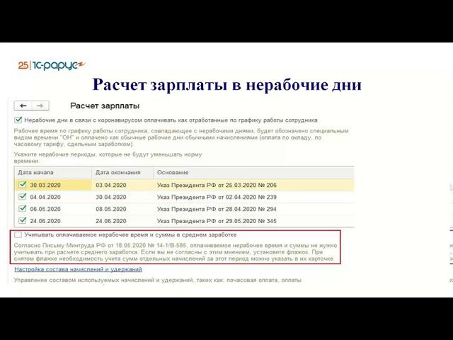 Запись вебинара от 21 сентября 2020 года на тему "Изменения в настройках кадрового учета и расчета заработной платы в ЗУП 3.1 в 2020 г". Программа вебинара: Нерабочие оплачиваемые дни: Законодательная база по возникновению нерабочих дней. Настройка нерабочих дней в 1С:ЗУП 8. Дополнительные настройки в 1С:ЗУП 8, связанные с возникновением нерабочих дней (производственный календарь, табель учета рабочего времени, графики). Отражение нерабочих дней в 1С:ЗУП 8. Настройка и расчет среднего заработка. Особенности отражения отпусков и больничных в период нерабочих дней. Новое за 3й квартал в настройках и отчетности в 1С:ЗУП 8 (20 мин): Новое в законодательстве, связанным с учетов в 1С:ЗУП 8. Новое в настройках за 3й квартал в 1С:ЗУП 8. Новое в отчетности за 3й квартал в 1С:ЗУП 8.