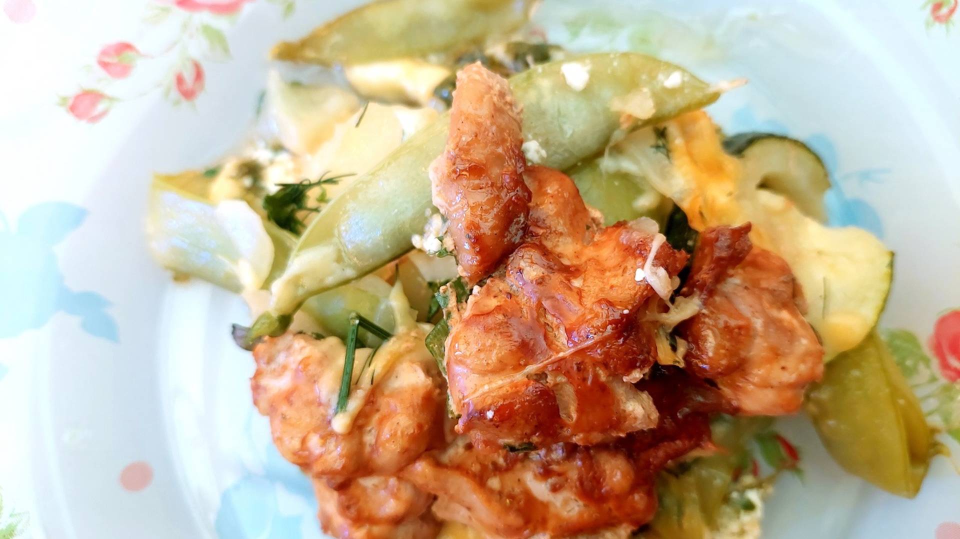 Запеканка приготовлена с использованием предварительно приготовленных овощей и маринованным филе куриных бёдер. Ярким акцентом запеканки являются молодые стручки - плюшки молодого зелёного горошка. В приготовленном виде они сладенькие и сворки получаются мягкие. Запеканка доготавливается в духовке, где образовывается аппетитная румяная куриная корочка. ИНГРЕДИЕНТЫ: Основа: • Картофель – 5 шт • Кабачок молодой – 2 шт • Лук репчатый – 1 шт • Стручки гороха – 40 шт • Соль – 0,5 чл • Филе куриного бедра – 2 шт Прослойки: • Сыр – 200 гр • Зелёный лук – 1 шт • Базилик – 3 л • Зелень укропа – 1 вет • Зелень кинзы – 1 вет Дополнительно: • Масло растительное – 3 стл • Сметана – 200 мл • Шрирача острый соус – 1 чл • Соус соевый – 1 чл • Приправа для курицы – 1 чл При приготовлении салата рекомендую ориентироваться на предоставленную видеоинформацию, свой вкус и предпочтения. Готовьте с удовольствием, экспериментируйте, пробуйте! ПРИЯТНОГО АППЕТИТА!!! Всем мира, бодрости духа и благополучия!