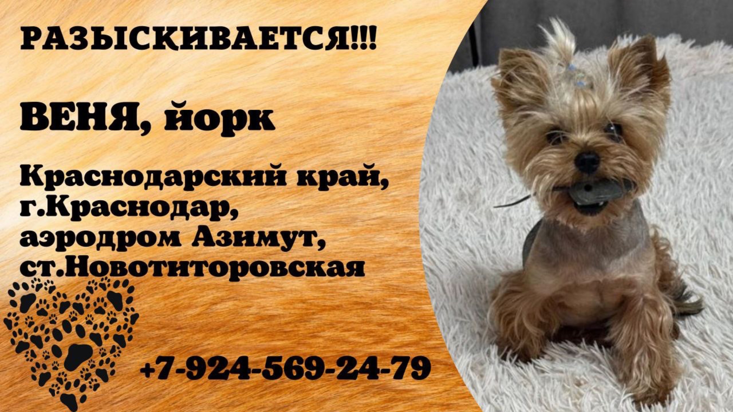 Краснодарский Краснодар Пропала собака Вчера 02.08.25 с 20.58 по 21.26 часов в районе аэродрома Азимут (ст.Новотиторовская, Динской район) потерялся йоркширский терьер, собачке 9 лет. Огромная просьба может кто подобрал, вернуть нам нашего питомца Имя хозяина: Юлия Телефон: 79245692479 Инфо: https://vk.com/wall-198815410_206001 #пропала_собака#краснодарский#краснодар#йорк