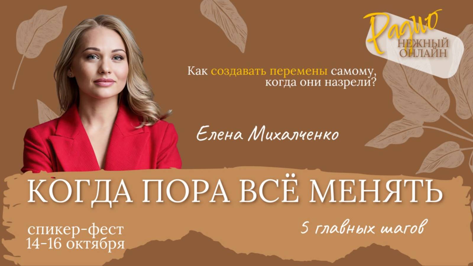 🔥 5 ГЛАВНЫХ ШАГОВ К ПЕРЕМЕНАМ Как быть если все вокруг рушится: Старые опоры, связи, отношения, доходы? Как создавать перемены самому, когда они назрели? На встрече обсудим 5 ключевых шагов как пройти через личный и профессиональный шторм изменений. С вами в эфире - ЕЛЕНА МИХАЛЧЕНКО (https://t.me/psyoffreedom) ✔️ Психолог ✔️ Карьерный стратег ✔️ Бизнес тренер ✔️ 20 лет управленческого опыта Автор книги Архитектура перемен Помогаю людям пересобрать карьеру, найти новое дело, создать устойчивое внутреннее состояние в период перемен. Мои специализация: 1️⃣сопровождение любых жизненных перемен и кризисов : развод, повторный брак, переезд, смена работы. 2️⃣Карьерное консультирование: сложные отношения в коллективе, управление командой, конфликты, смена работы и поиск нового дела. 3️⃣ психотерапия уверенности: эмоциональное и психологическое взросление, ресурсная опора на себя. 🔻 ______________________________________ 🎙Если вы хотите стать спикером радио, попасть на подкаст, открыть свою передачу, пишите 👉 сюда https://t.me/m/sApQQFV0ZDgy
