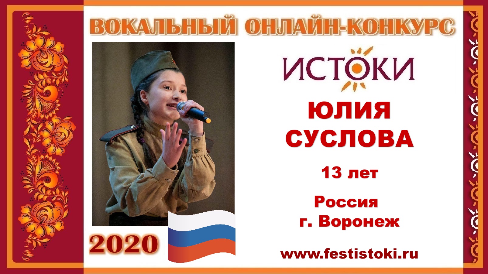 Участница Вокального онлайн-конкурса "Истоки"-2020. Песня "За тебя, Родина-мать!". Автор: И.Матвиенко. Сайт: www.festistoki.ru / www.festistoki.com E-mail: festistoki@mail.ru