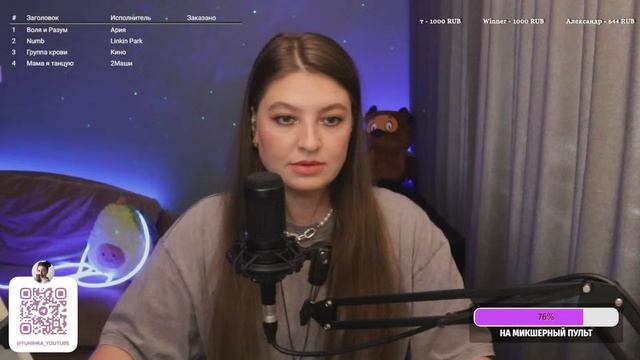 Привет, дорогой зритель! Меня зовут Юля, и я очень рада тебя видеть здесь на моем канале) Сегодня я провожу прямую трансляцию и поэтому прошу Тебя поддержать меня ну и конечно же петь песни вместе со мной Ссылка на донат ИЛИ если вы хотите увидеть свое сообщение на экране - https://www.donationalerts.com/r/yunihka Если просто хотите поддержать мое творчество номер карты СБЕР: 4276550062989176 Заказ песни вне очереди 100 р. ЧТО Я МОГУ СПЕТЬ ДЛЯ ТЕБЯ смотри тут https://disk.yandex.ru/i/YTq-QLQ9VLuGvA https://www.streamersonglist.com/t/yliannohka/songs?f=New Вы так же можете получить сигну написав в чат "ХОЧУ СИГНУ" и забирать ее в телеграмме Так же сигна делается автоматически всем, кто отправил донат Хочу сказать огромное СПАСИБО всем донатерам и просто случайным зрителям! Я надеюсь Вам все понравится ❤️ ИЩИТЕ МЕНЯ ЗДЕСЬ: инстаграм (запрещен в РФ): https://www.instagram.com/yunihka/ (@yunihka) вк: https://vk.com/yunihka Телеграмм: https://t.me/yunihka_youtube #стрим#караоке#разговоры#живойзвук#вокал#живойвокал#поем#петь#музыка#поемкараоке#петькараоке#cover#music#стрим#прямойэфир#караоке