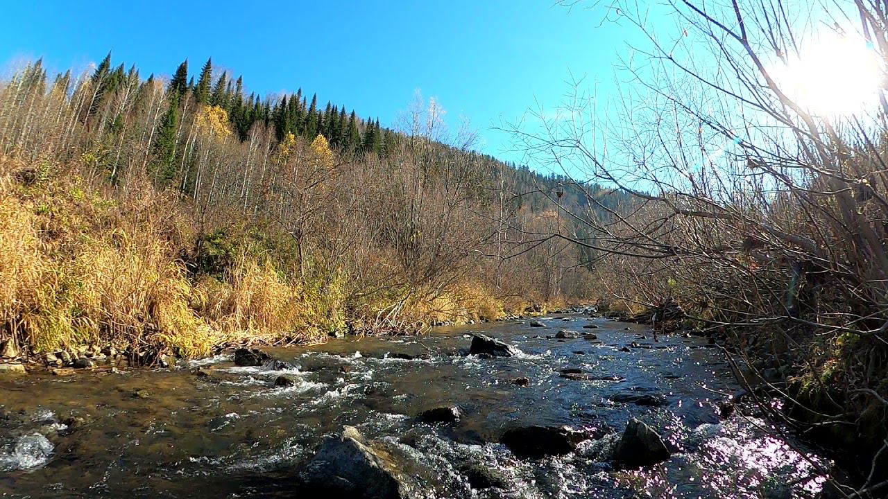 шумит ручей, крики ворона, сорока трещит, поздняя осень..