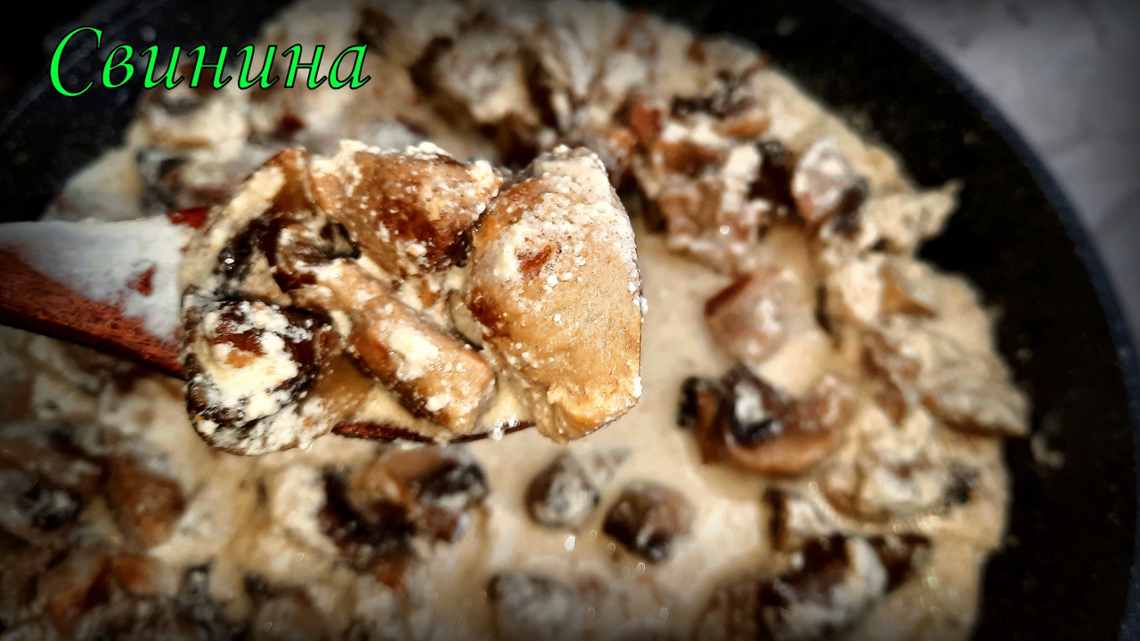 Свинина, тушенная с грибами, в сметанном соусе.