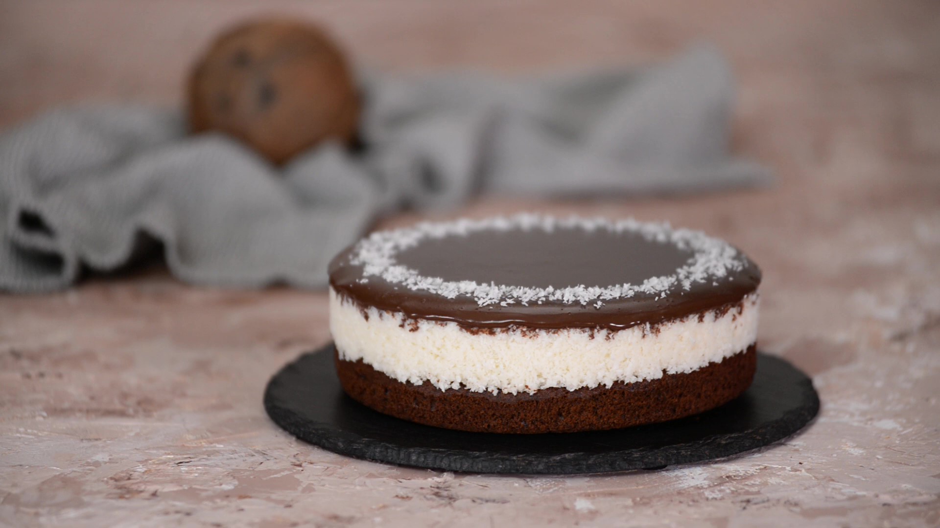 Ингредиенты: Для бисквита: Размягчённое сливочное масло — 100 г. Сахар — 80 г. Яйца — 1 шт. Натуральный йогурт 8% — 75 г. Мука — 100 г. Какао-порошок — 20 г. Разрыхлитель — 5 г. Соль — щепотка Ванильный экстракт — 2 ч.л. Для кокосовой начинки: Сливки 20% — 180 мл. Сливочное масло — 80 г. Сахар — 90 г. Кокосовая стружка — 220 г. Для шоколадной глазури: Молочный шоколад — 50 г. Тёмный шоколад — 50 г. Горячие сливки 20% — 100 мл. Все ингредиенты для бисквита должны быть комнатной температуры. 1. Разогреть духовку до 180 °С. 2. Приготовить шоколадный бисквит. В миске смешать муку, какао-порошок, разрыхлитель и соль. Отложить в сторону. 3. Размягчённое сливочное масло соединить с сахарным песком. Взбить миксером в течение 2 минут. Затем добавить ванильный экстракт, яйцо и сметану, взбить до однородной массы. Продолжая взбивание постепенно ввести сухие ингредиенты и взбить до однородной массы. 4. Готовое тесто вылить в форму диаметром 20 см, застеленные пергаментной бумагой. Выпекать в разогретой духовке 25-30 минут. Готовность бисквита проверить деревянной шпажкой, если при прокалывании она выходит чистой из бисквита — значит он готов. 5. Готовый бисквит вынуть из духовки и остудить на решётке. 6. Приготовить кокосовую начинку. В сотейнике соединить сливки, сливочное масло и сахар. На средне огне довести массу до кипения, затем снять с огня. Залить кокосовую стружку горячей сливочной смесью и хорошо перемешать, пока кокос не впитает всю жидкость. 7. Полученную кокосовую массу равномерно распределить поверх приготовленного бисквита. Убрать в холодильник на 1 час. 8. Приготовить глазурь. Шоколад залить горячими сливками и хорошо перемешать до полного растворения шоколада. 9. Вылить глазурь поверх кокосовой начинки и равномерно распределить. Убрать в холодильник на 2 часа. 10. Готовый торт по желанию украсить кокосовой стружкой.