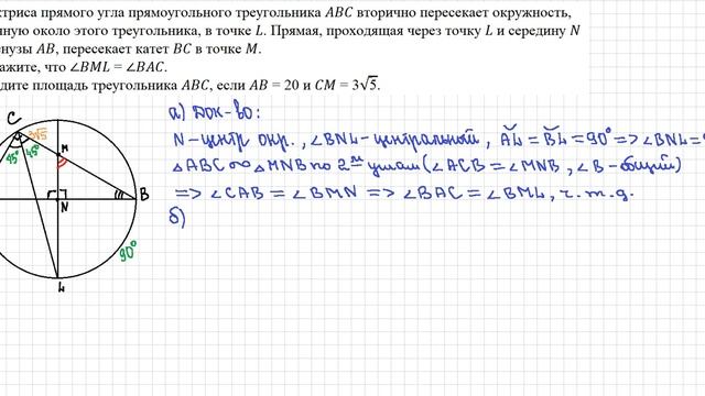 Биссектриса прямого угла прямоугольного треугольника вторично пересекает окружность, описанную около этого треугольника, в точке . Прямая, проходящая через точку и середину гипотенузы , пересекает катет в точке . а) Докажите, что ∠ = ∠. б) Найдите площадь треугольника , если = 20 и = 3√5.