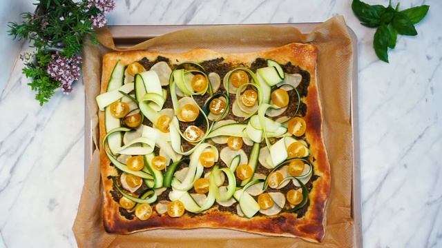 Лёгкий рецепт летней выпечки;) Ингредиенты: Тесто слоеное бездрожжевое на слив. масле, 500 г – 1 уп. Соус «Песто» классический – 1 уп. Картофель молодой – 3 - 4 шт Цукини – 1 шт Кабачок – 1 шт Патиссоны – 2 - 3 шт Томаты черри – 150 г Сыр «Моцарелла перлини» – 1 уп. Базилик, тимьян – по вкусу Масло оливковое Extra Virgin – 1 ст.л. Соль морская – 1 ч.л. Перец чёрный горошком мельница – 1 ч.л. 1. Предварительно размороженное тесто раскатайте по размеру противня, выложите на пергамент и надколите вилкой в нескольких местах, чтобы оно не поднималось. 2. Равномерно распределите по тесту соус песто. Нарежьте картофель очень тонкими кружками, выложите поверх песто. Запекайте в разогретой до 180С духовке около 15 минут. 3. Нарежьте цукини кабачок тонкими полосками вдоль, удобно это делать овощечисткой. Патиссоны нарежьте тонкими пластинами, томаты черри пополам. Выложите овощи на пиццу, добавьте соль, перец и оливковое масло. Запекайте ещё около 10 минут. На готовую пиццу добавьте маленькие шарики моцареллы перлини, добавьте свежий базилик, тимьян и ещё немного оливкового масла. Приятного аппетита! ... Наш интернет-магазин: https://vkusvill.ru/goods/ Яндекс.Дзен с рецептами для тех, кто предпочитает читать: https://clck.ru/NwaiW Инстаграм для тех, кто за эстетику: https://www.instagram.com/vkusvill_ru/ #вкусвилл #рецепты #ВВрецепты