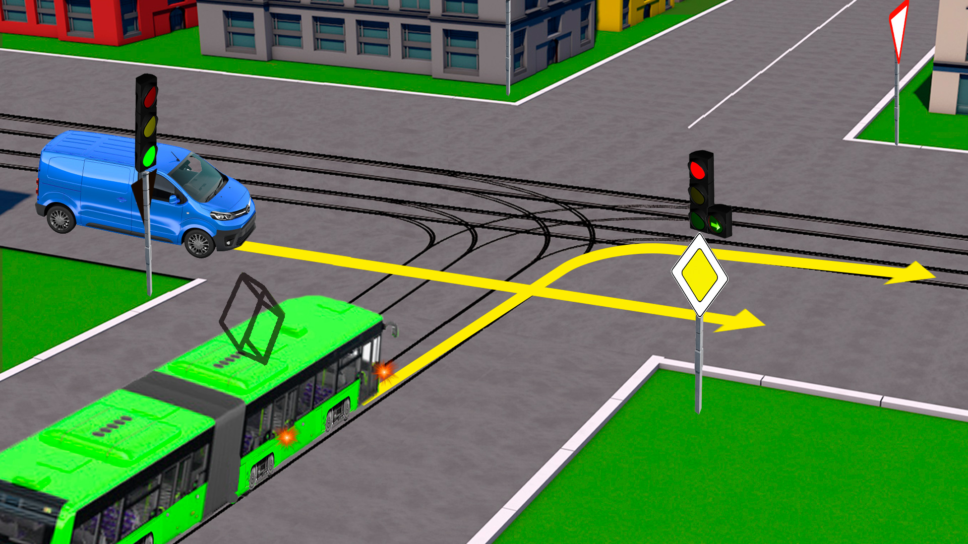 Редко встречаясь с трамваями, большинство водителей предпочитают уступать дорогу всегда. Но трамвай не всегда имеет преимущество. Решите эту задачу сами и поделитесь задачей с друзьями. Возможно, им тоже будет интересно.