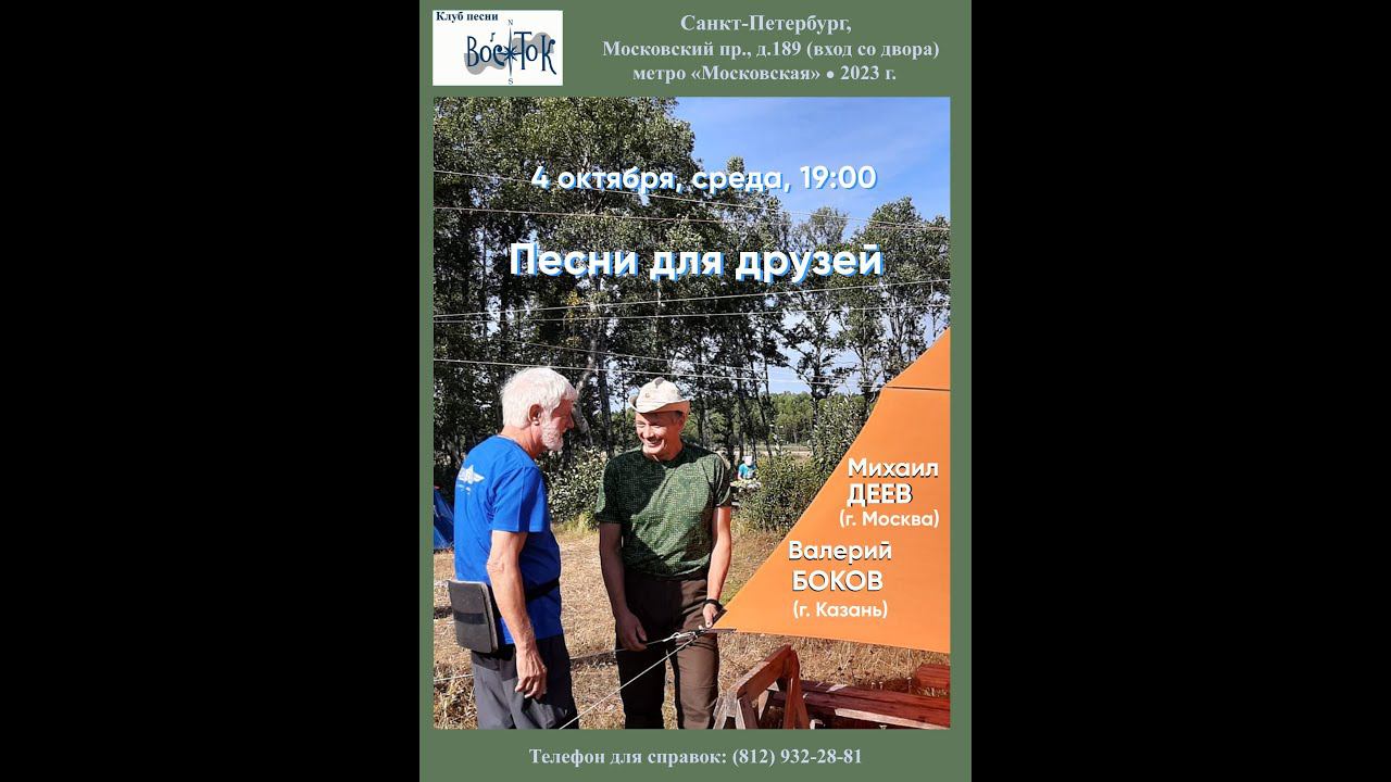 Валерий Боков и Михаил Деев. «Песни для друзей». Клуб песни «Восток». 4 октября 2023 г. Ведущий - Валентин Вихорев. Санкт-Петербург, Московский пр., д. 189. Видеозапись - Алла Левитан. Запись и обработка звука - Герман Колосов. Афиша - Лев Мильчин.