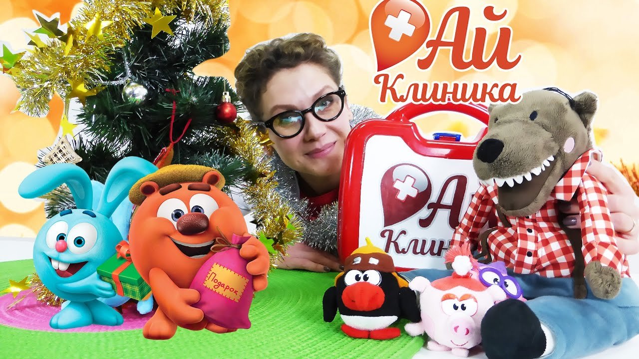 Сегодня #СМЕШАРИКИ НЮША, ЕЖИК, КОПАТЫЧ, ПИН и КРОШ ждут в гости ДОКТОРА АЙ, чтобы украсить новогоднюю ёлку! Только вот Доктор Ай пришла какая-то странная… У неё такие большие уши, такой странный голос… Да это же Волк! Он притворился Доктором Ай и поймал Смешариков, чтобы повесить их на ёлочку, как новогодние шарики! Кажется, ему просто хотелось отпраздновать НОВЫЙ ГОД... Смотри наше новое новогоднее видео и узнаешь, как Доктор Ай справилась с ситуацией! Не забудь подписаться, доктор АЙ ждёт тебя и твои игрушки на приём в АЙ-Клинику по адресу: https://www.youtube.com/channel/UCGniralnly1KvmlBMjGEVLA Подписывайся на наших друзей, канал Смешарики Live: https://www.youtube.com/channel/UCy15c4beE539pcPFt4-UrHg Не забудь подписаться на канал СТРАНА ДЕВЧОНОК, чтобы следить за новыми приключениями: https://www.youtube.com/channel/UCCe6oRAVWZFztZJMAujRu7A Заходи на канал, где живут наши лучшие подружки - Бантики-Косички: https://www.youtube.com/channel/UCZJi3695pl6tfkAHp4BLMDA Заходи к нам на сайт: http://www.4screens.ru/ Ищи нас в социальных сетях! ВКонтакте: https://vk.com/club132423271 Фейсбук: https://www.facebook.com/4ScreensShow Твиттер: https://twitter.com/4Screens_Studio Инстаграм: https://www.instagram.com/4screensstudio/