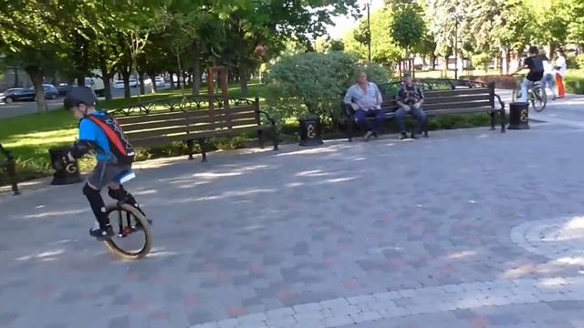 Я тоже решил попробовать. Ничего не получилось. Что мне удалось, так это только посидеть на уницикле, с одной стороны меня придерживал глава семейства, с другой я сам держался за столб. Как это у них получается??? Кстати, взрослый уницикл стоит 650 евро !!!
