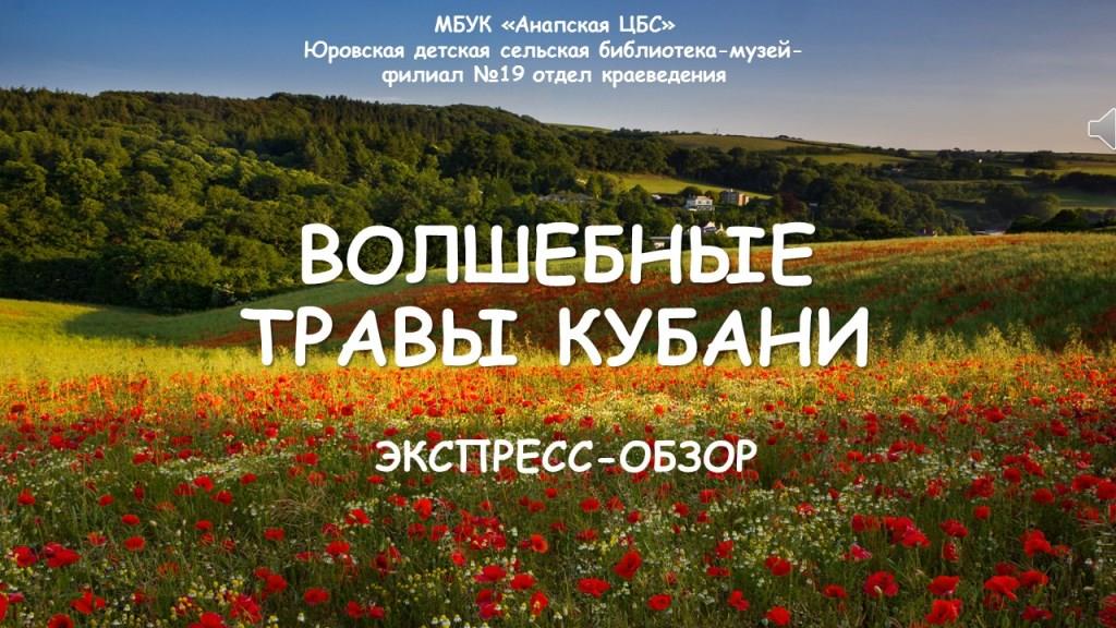 Невозможно назвать точный день, даже год, столетие или тысячелетие, когда древнему человеку впервые пригодились растения в качестве средства избавления от недугов. Наши предки пользовались чудодейственными лекарственными дарами природы испокон веков. Невероятно много лекарственных растений произрастает в щедром Краснодарском крае. Всего видов подобной флоры выявлено порядка трёх тысяч, и все они обладают совершенно исключительной, можно сказать – фантастической и богатырской исцеляющей силой. А причины подобного разнообразия и эффективности понятны – мягкость климата и поразительное плодородие кубанской земли. Экспресс-обзор «Волшебные травы Кубани» расскажет нашим маленьким читателям о пользе растений через сказку «Волшебная травка зверобой», такую популярную и светлую, придуманную детским писателем Сергеем Козловым. Подготовлено заведующим отделом краеведения Юровской детской сельской библиотеки-филиала №19 И.В.Димитрашко