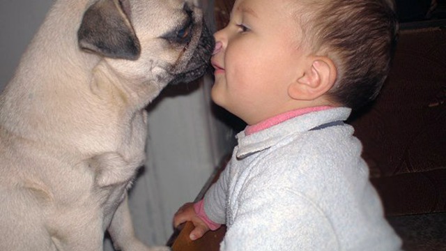 Пёс щекочет малыша