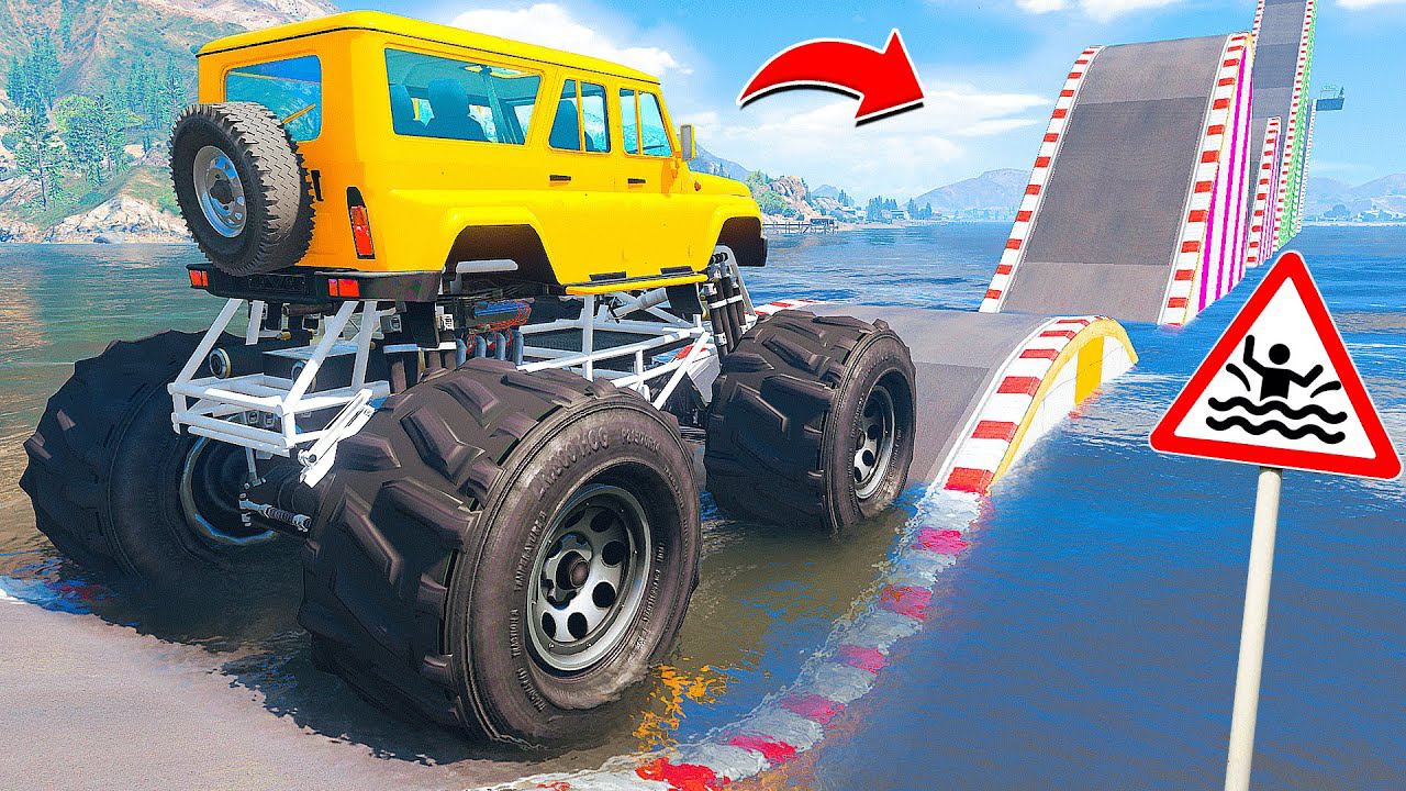 СМОЖЕТ ЛИ ГИГАНТСКИЙ УАЗИК БИГФУТ ПРОЕХАТЬ ВОДНЫЕ ТРАМПЛИНЫ в ГТА 5 МОДЫ - ЭКСПЕРИМЕНТЫ в GTA 5 MODS