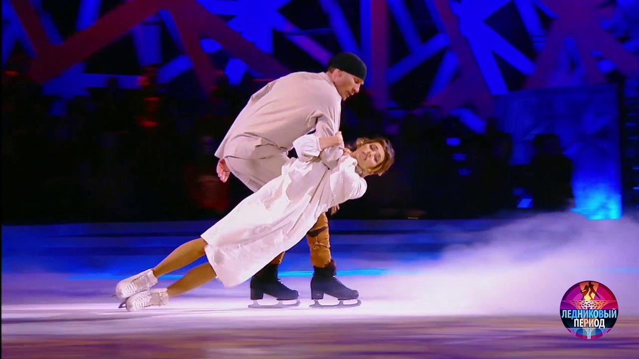 На льду — телеведущая Регина Тодоренко и олимпийский чемпион Роман Костомаров. Они танцуют под песню «Тропы» в исполнении Пелагеи.