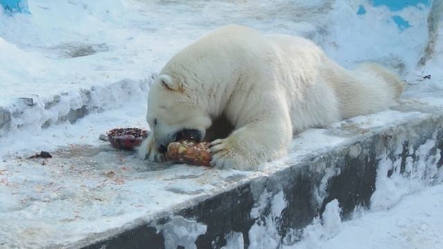 Белый медведь Кай кушает