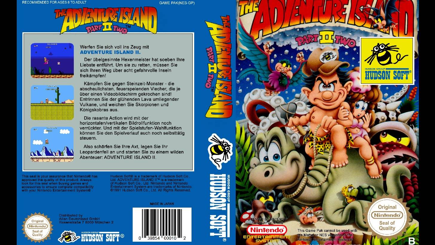 "ADVENTURE ISLAND 2" ("TAKAHASHI MEIJIN NO BOUKEN JIMA II") - компьютерная игра в жанре платформера, разработанная и выпущенная компанией HUDSON SOFT для игровой консоли Famicom и позднее NES в 1991 году. Является адаптацией игры "WONDER BOY", разработанной компанией SEGA для своей домашней консоли 8-bit SEGA MASTER SYSTEM. Игрок управляет Мастером Хиггинсом, который исследует архипелаг в поисках похищенной девушки. По сравнению с первой частью игры, геймплей практически не изменился. Персонаж может разгоняться, прыгать, а также атаковать врагов оружием, которое находится в яйцах, расположенных на уровнях. Присутствует ограничение по времени; чтобы увеличить значение на таймере, нужно собирать фрукты или мясо. Для перехода на следующий остров необходимо победить босса. В игру добавлен инвентарь-склад, теперь перед началом каждого уровня игрок может взять оттуда оружие или динозавра-помощника, либо наоборот, поместить туда найденное на предыдущем уровне. Каменные топорики не трансформируются в огненные книппели: если подобрать второй топорик, он автоматически добавится в инвентарь. Кроме оружия, игрок может найти на уровне одного из четырёх динозавров-помощников, которые обозначены карточными мастями. Тогда герой превращается в наездника и продолжает движение по уровню, используя способности помощника. При контакте с врагом, кострами, шипами и пр. динозаврик умирает, и Мастер Хиггинс, если это возможно, должен завершить уровень в одиночку. Скейтборд теперь не переносится на следующий уровень и не сохраняется в инвентаре. На конечной точке он исчезает и игроку добавляется 2000 очков. Каждые 20000 очков дают жизнь. Между уровнями персонаж попадает в специальную комнату, где появляется вращающееся кольцо из восьми яиц. Игроку предлагается сделать случайный выбор, с возможностью получить от 50 до 2000 очков, либо жизнь. Система чекпойнтов теперь отсутствует. Если герой умирает, то игрок должен пройти весь уровень заново; сами уровни, по сравнению с предыдущей частью, стали короче. Присутствуют подводные уровни и уровни с вертикальной прокруткой. Это единственная часть игры, где на горизонтальных уровнях можно двигаться назад, но лишь до определённых точек. На каждом острове находится около десяти локаций, при этом стартовая точка и местоположение босса изначально известны. В процессе игры происходит случайное и не зависящее от игрока перемещение по точкам на карте от стартовой позиции к боссу. При этом некоторые локации не будут посещены. Однако, если герой погибнет в битве с боссом, то босс переместится в одну из непосещённых ранее точек на карте, и игроку для повторной битвы нужно будет ещё раз пройти текущую локацию, а затем завершить уровень в точке, куда переместился босс. Если герой погибнет ещё раз, то босс продолжит перемещаться по непосещённым локациям острова до тех пор, пока таковых вообще не останется. Если истратить все попытки, то игроку придётся начинать процесс заново. Количество продолжений не ограничено. Если битва происходит с помощником, то герой слезет с него, и на экране будут два персонажа, которыми игрок сможет управлять параллельно. Преимущество помощника в том, что в этой битве он неуязвим, он также может атаковать, и, кроме того, отвлекает на себя все атаки босса. Если же герой дошёл до босса вообще без оружия, то его можно будет получить на экране битвы.