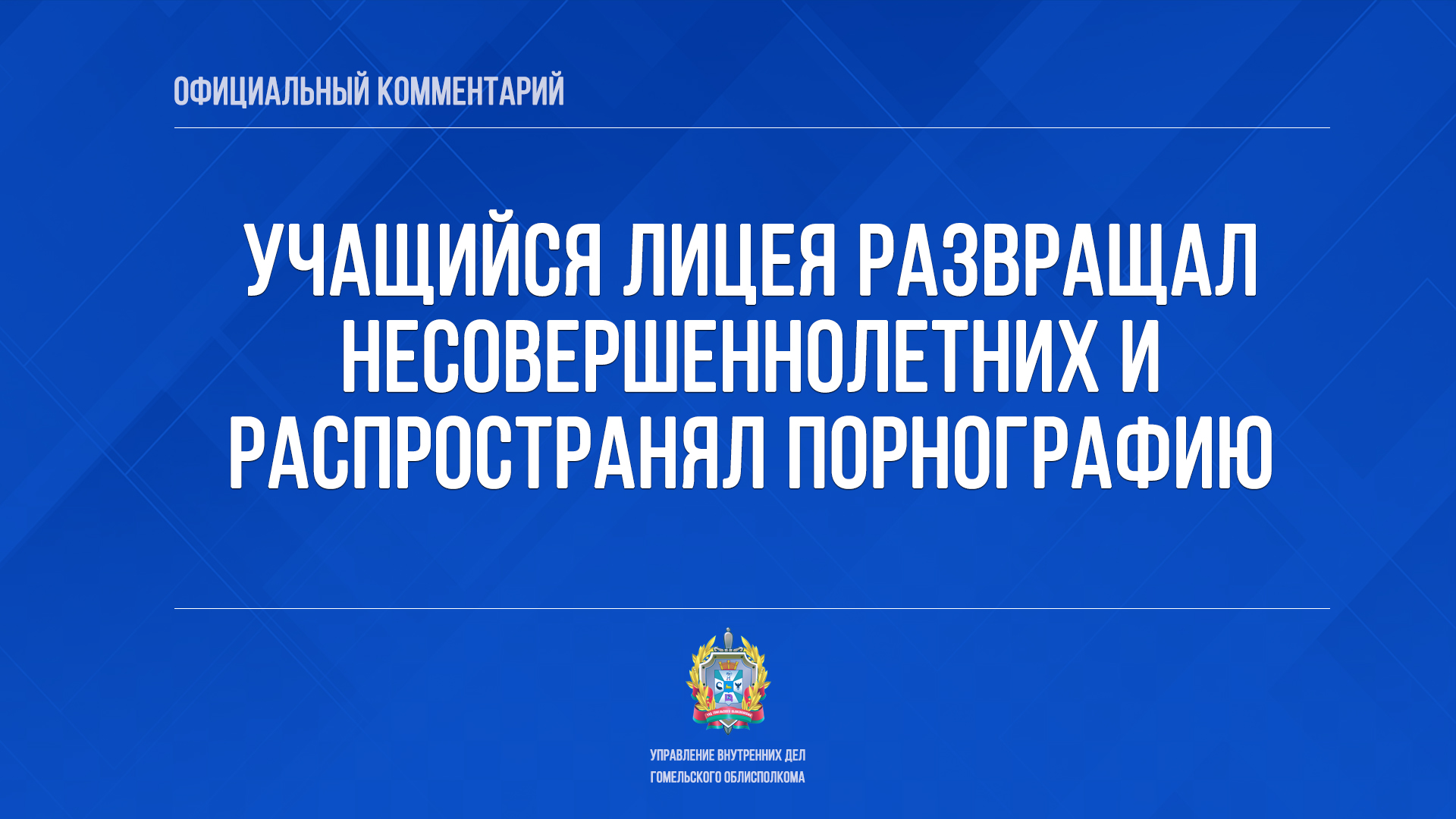 19-летний житель Гомеля обучался в одном из речицких лицеев. Кроме учёбы учащийся постоянно общался в социальных сетях. Основная цель - знакомства с дальнейшим намеком на сексуальные отношения. Знакомясь с девочками, в том числе намного моложе себя, вел разговоры на сексуальные темы без границ. Войдя в доверие – просил фото интимного характера. Некоторые соглашались не только на фотографии. При просмотре его аккаунтов стало ясно, что некоторые свои утехи, в том числе и с подростками, он снимал на телефон и неоднократно распространял в социальной сети. Следователями в отношении лицеиста возбуждено сразу несколько уголовных дел. В частности, по неоднократным фактам развратных действий, за изготовление и распространение порнографических материалов или предметов порнографического характера, в том числе с изображением несовершеннолетнего.